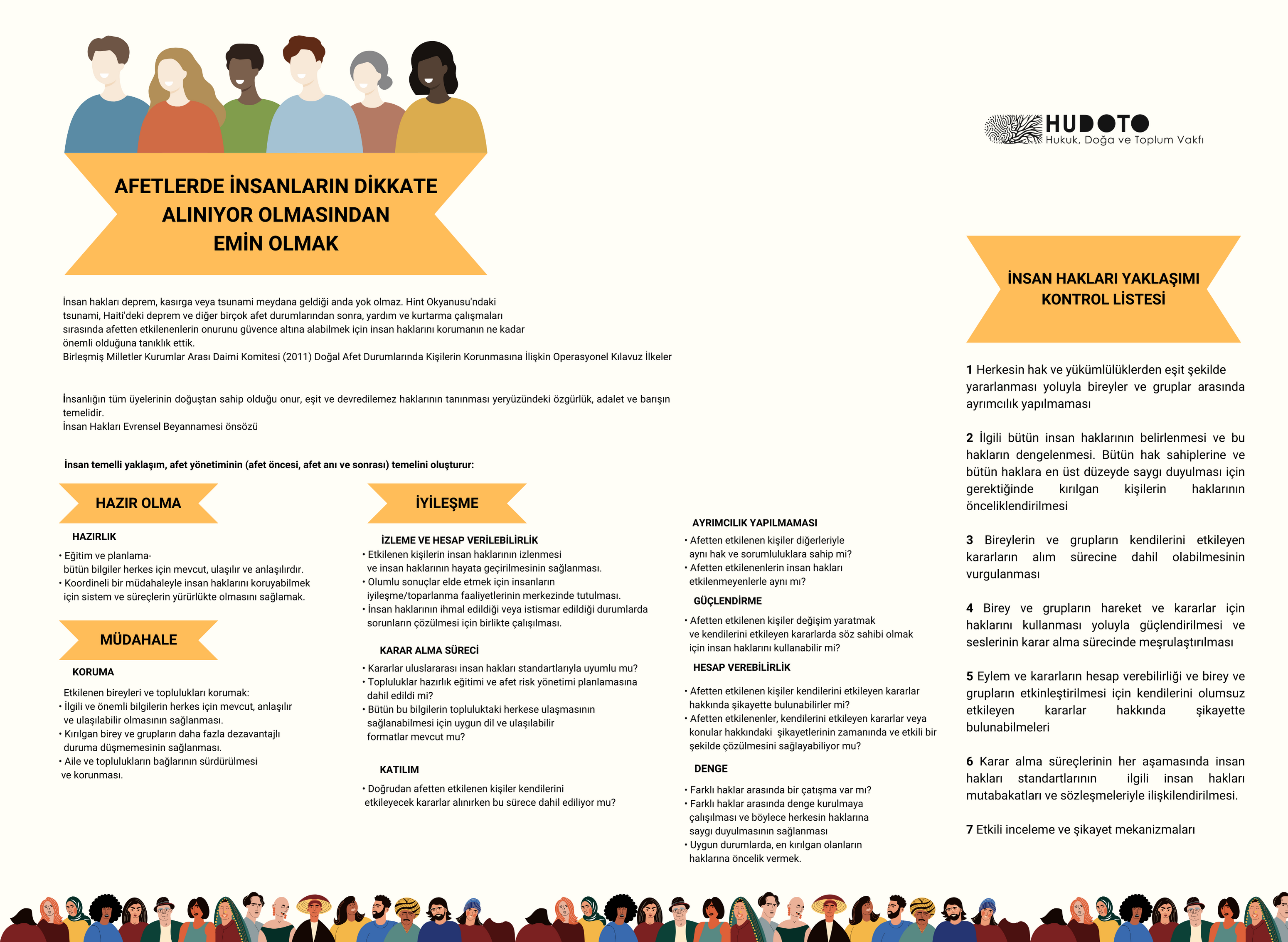 İnsan hakları deprem, kasırga ya da tsunami meydana geldiği anda yok olmaz. Hint Okyanusu'ndaki tsunami, Haiti'deki deprem ve diğer birçok afet durumlarından sonra, yardım ve kurtarma çalışmaları sırasında afetten etkilenenlerin onurunu güvence altına alabilmek için insan haklarını korumanın ne kadar önemli olduğuna tanıklık ettik. (Birleşmiş Milletler Kurumlar Arası Daimi Komitesi (2011) Doğal Afet Durumlarında Kişilerin Korunmasına İlişkin Operasyonel Kılavuz İlkeler)